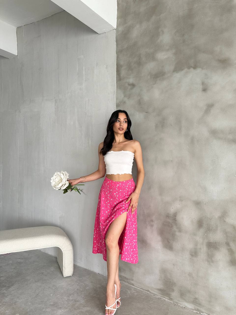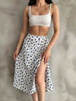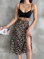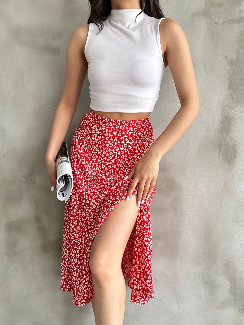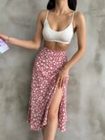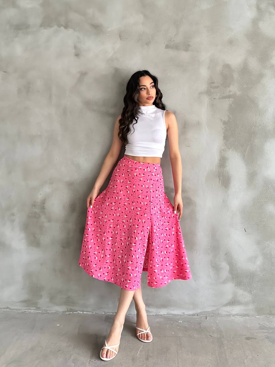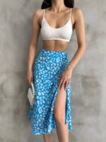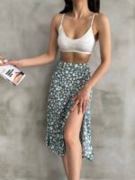 Designed by Ceta Group for its summer collection, this green floral print skirt offers an energetic style inspired by nature. Thanks to its lightweight textured fabric and fresh design, it provides a comfortable wear on hot summer days, while the front slit detail gives the skirt an elegant movement.